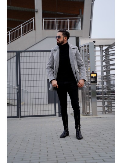 Charakterystyczna budowa pleców zapewnia pełną swobodę ruchów. Szary płaszcz LYON wykonany z wełny w prążek należy do najbardziej
